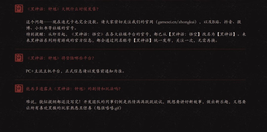 《黑神话:钟馗》在公布后,游戏官网同步上线,官网的“常见问题(FAQ)”回答了为什么先做钟馗而不是《悟空》续作、二者之间有什么联系、什么时候发售、登陆什么平台等问题。