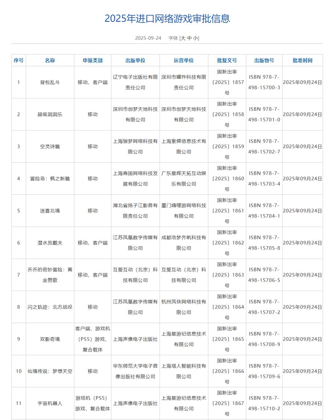 2025年9月国产和进口网络游戏版号共156款获批,包括腾讯《归环》、米哈游《崩坏:因缘精灵》、网易雷火《星绘友晴天》等重点游戏。
