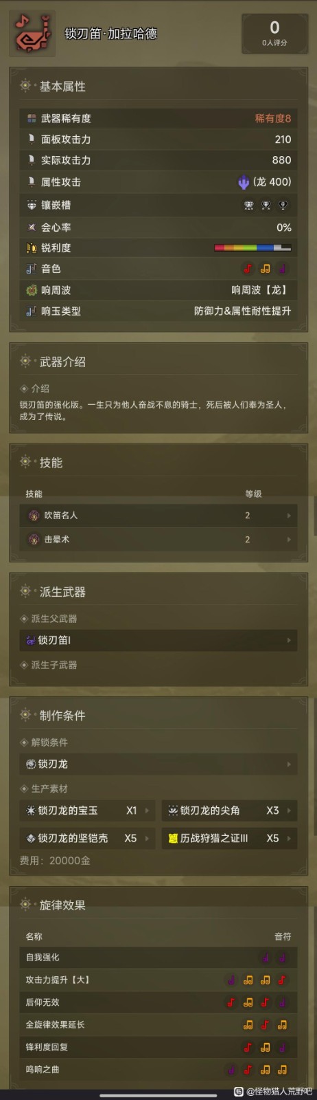 自带吹笛2,会心攻击响玉,防御大,单武器拿出来可能说不怎么完美,但是在双武器的组合下真的很神。