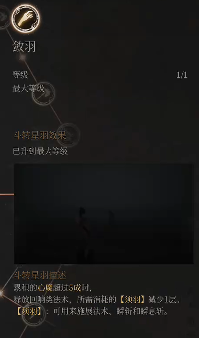 以及通用分支的【敛羽】——累积的心魔超过5成时,回响类法术消耗的【须羽】减少1层。(心魔可通过神龛处求施提升)