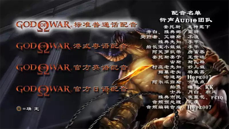 这次粤语的配音是由香港战神有爱配音组完成的,这个配音团队正是动画电影哪吒1和哪吒2的粤语版配音团队,专业性毋庸置疑,我们在进入游戏之前,可以根据自己的喜好,选择普通话配音,粤语配音,或者是官方日语和官方英语配音,这可是战神系列,第一次有了中文配音的版本。