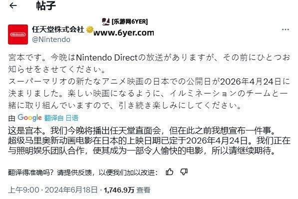 根据NBC环球最新发布的片单公告,任天堂与照明娱乐联合打造的新一部超级马里奥兄弟动画电影正式定名为《超级马里奥世界》。该片预计将于2026年4月3日在美国首映,...