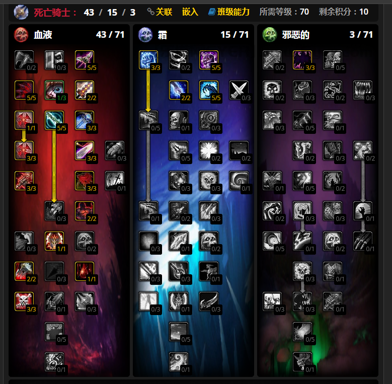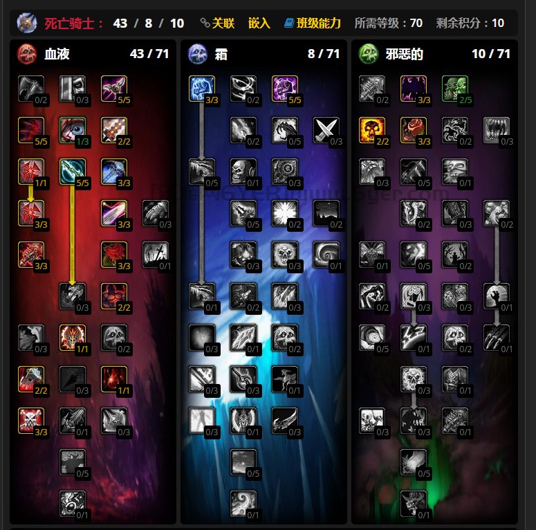 魔兽世界WLK怀旧服前夕鲜血DK天赋加点推荐,推荐43/ 15/ 3或43/ 8/ 10,另外附前夕版本雕文推荐。