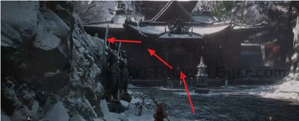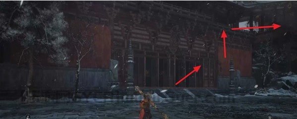从地图庙小雷音寺寺门出发,先穿过中间房间,走到第一个楼梯上方然后往左边区域跳下去,