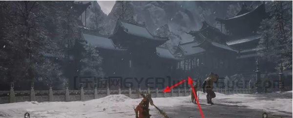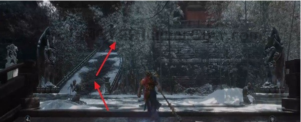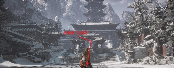 由于小雷音寺中只有两个土地庙,所以我们这里不以土地庙为起点,首先来到小雷音寺大殿前的广场(楼梯下方),下图箭头是从土地庙【大殿】往下走。