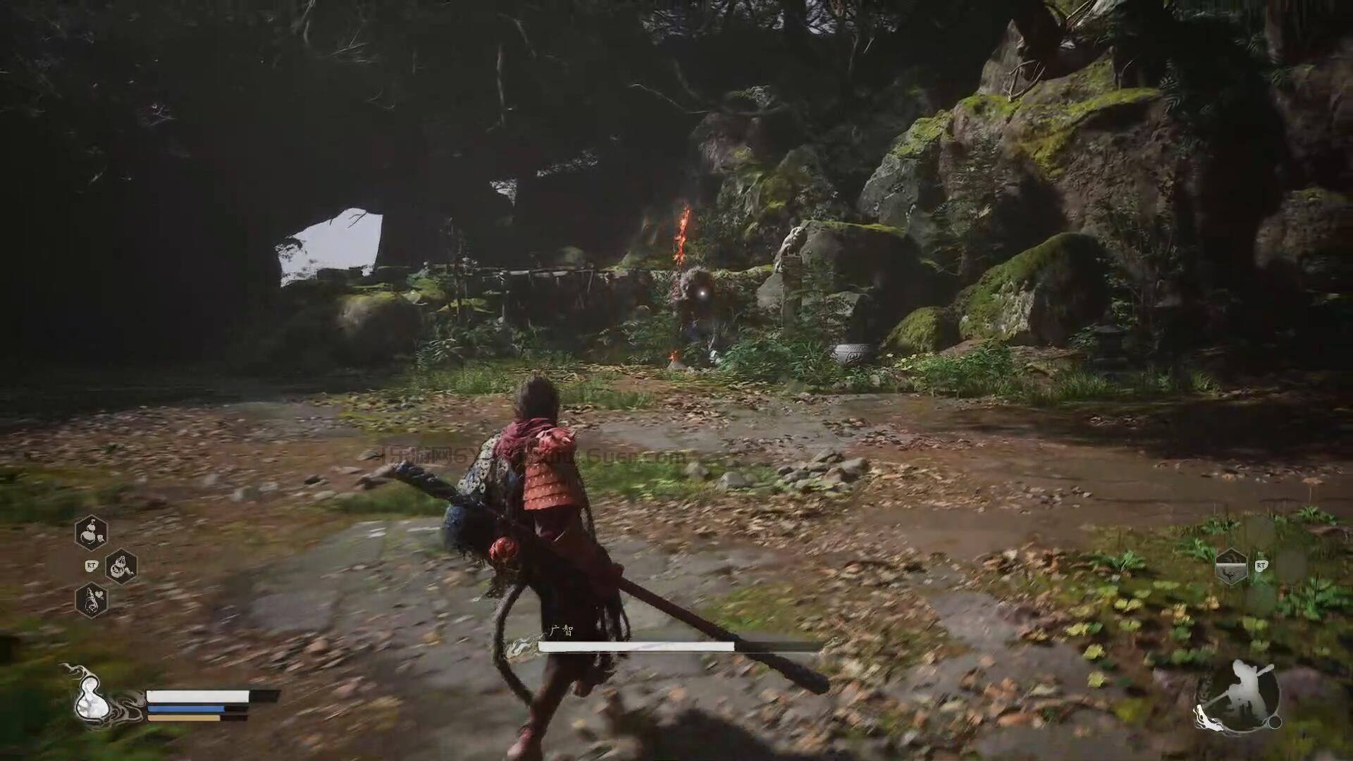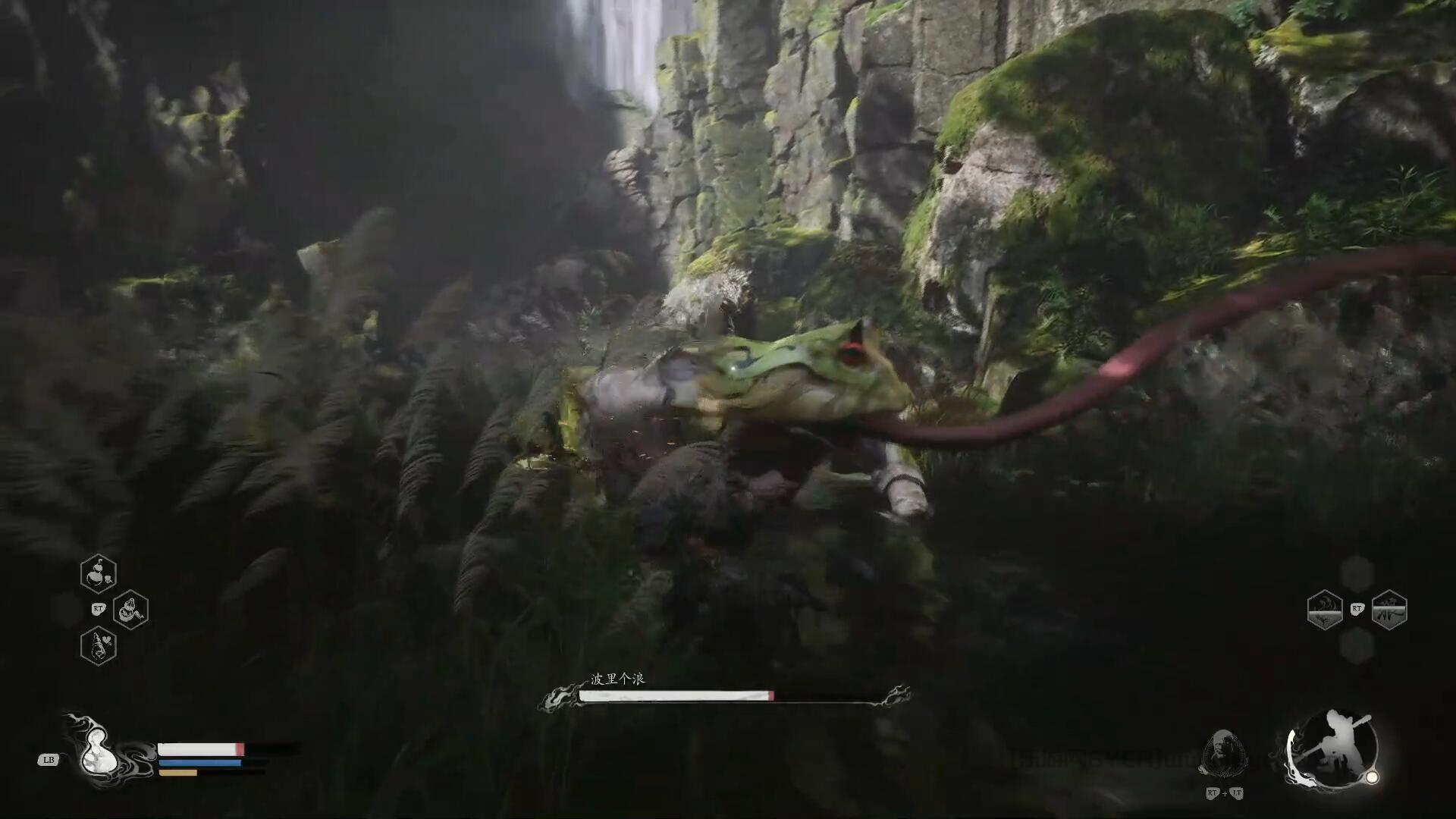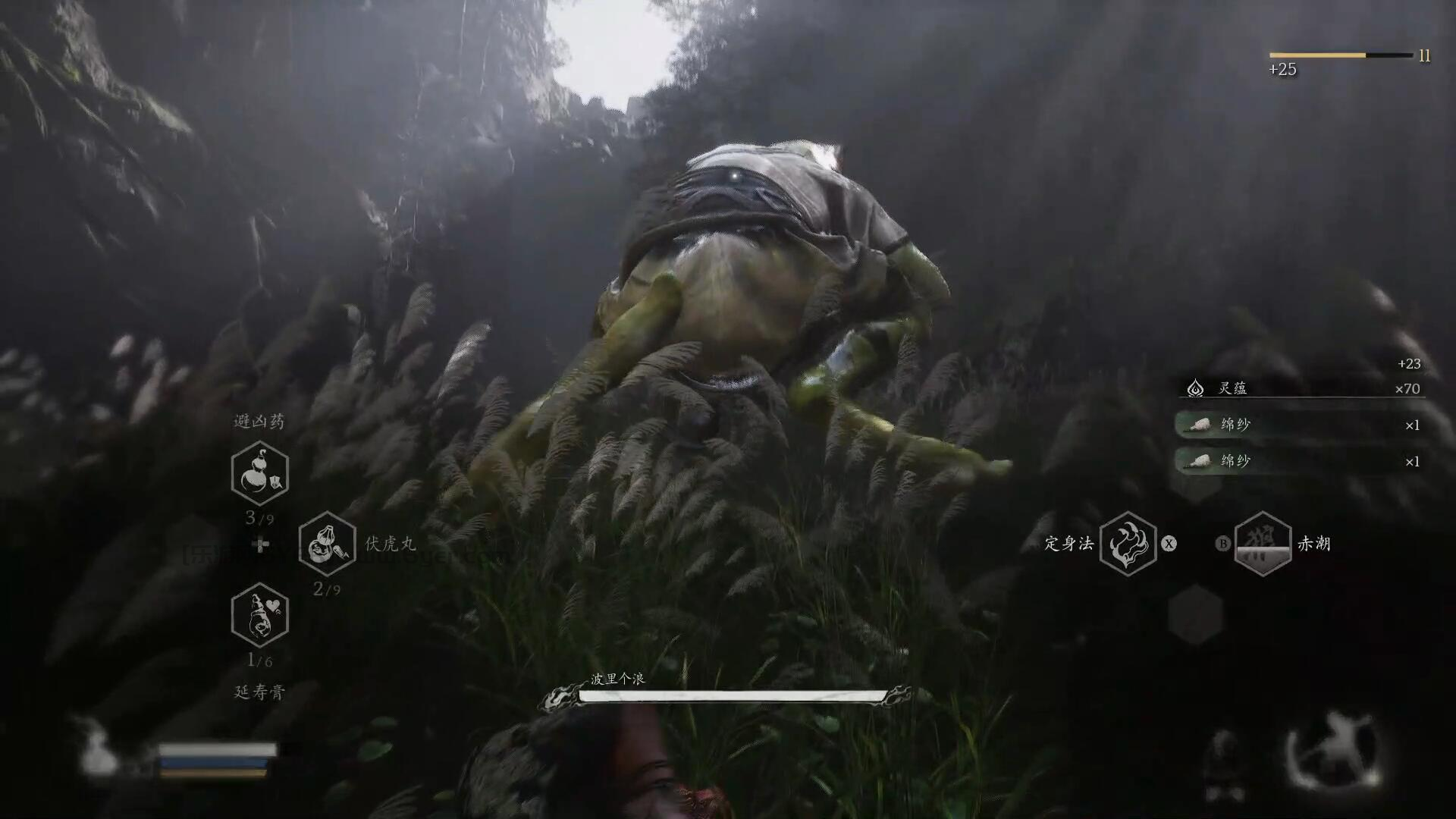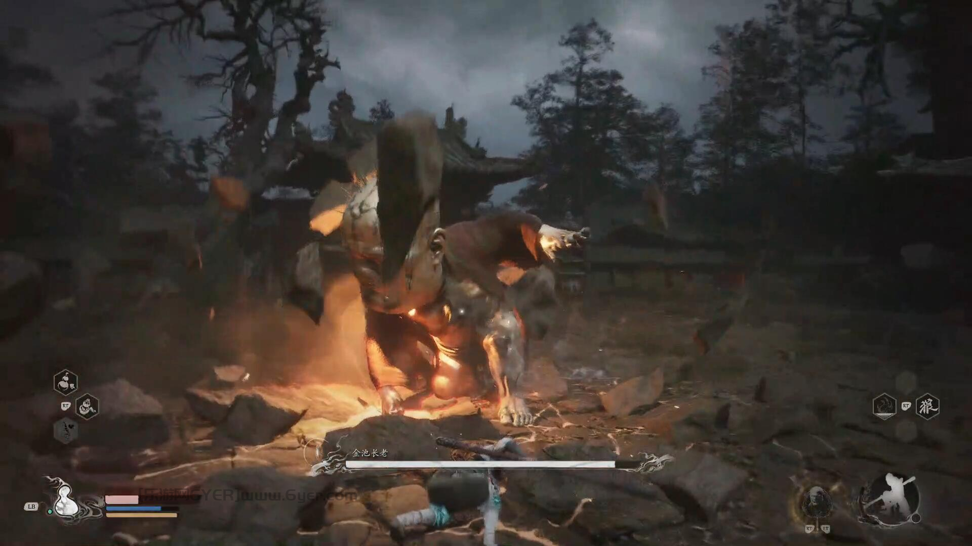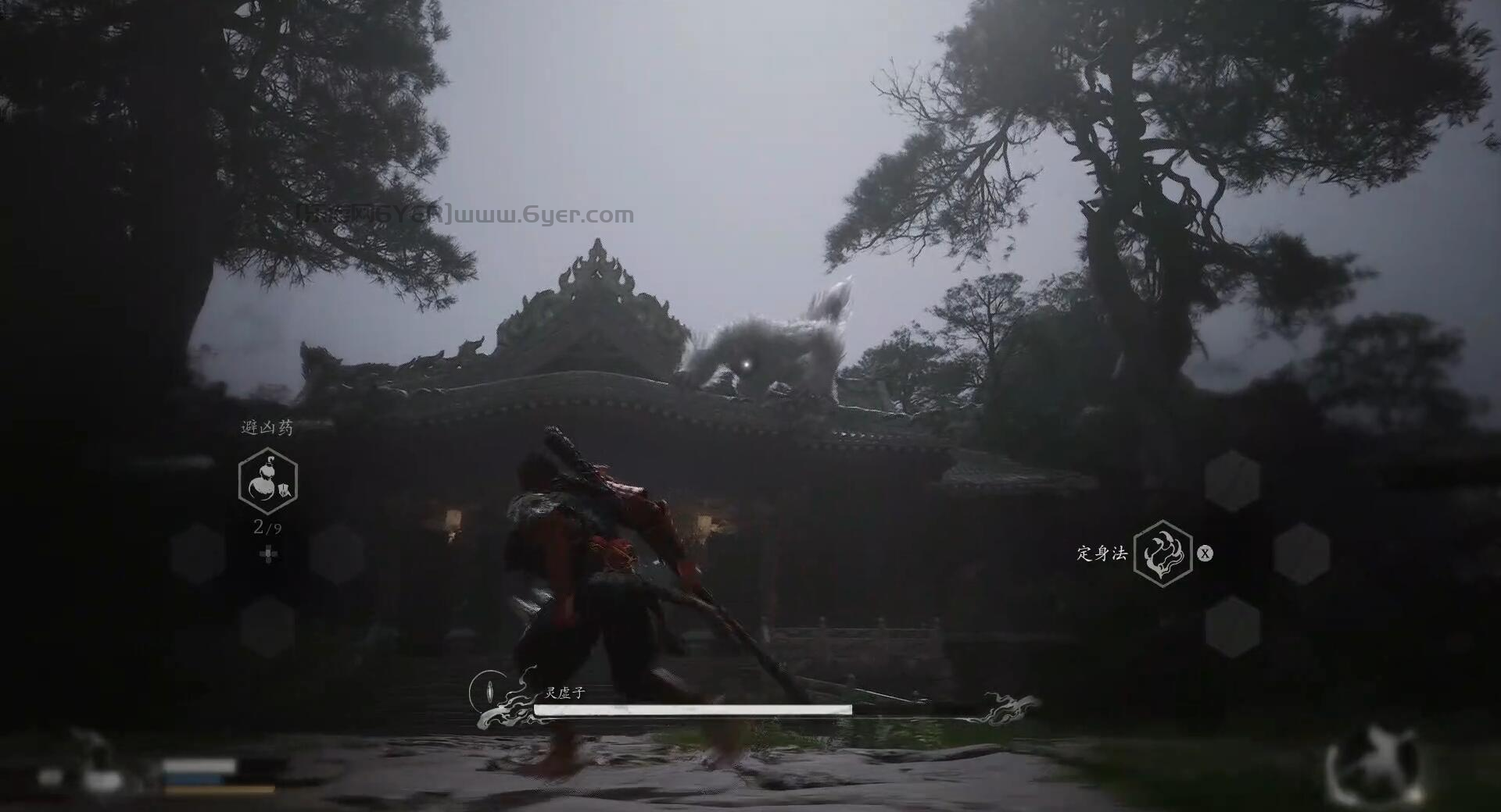 应对讲解:反应较快的玩家可以在灵虚子起跳一瞬间进行闪避,这个时机可以保证安全,如果闪避不够熟练也可以提前按住定身术,在灵虚子起跳前立刻定住它,将其攻击动作打断,并进行一段可观的输出循环。