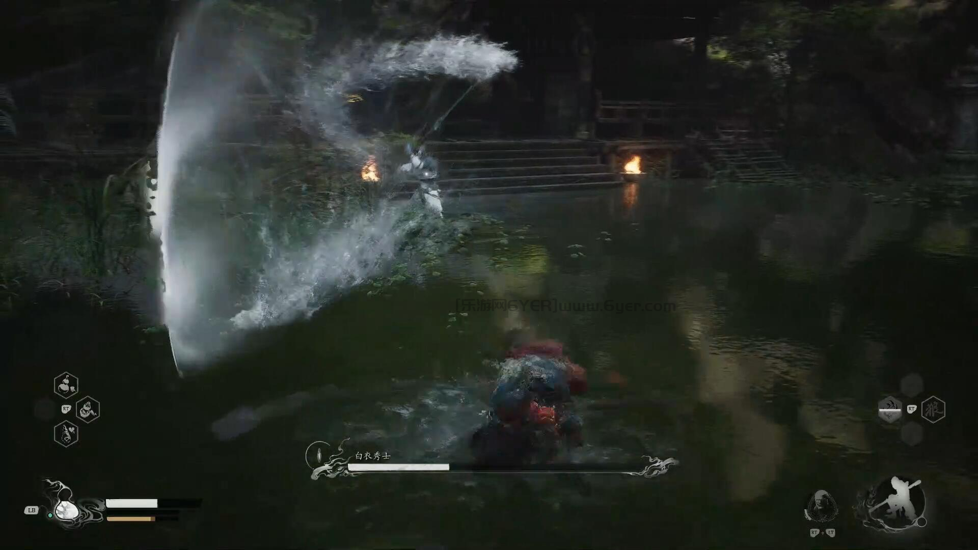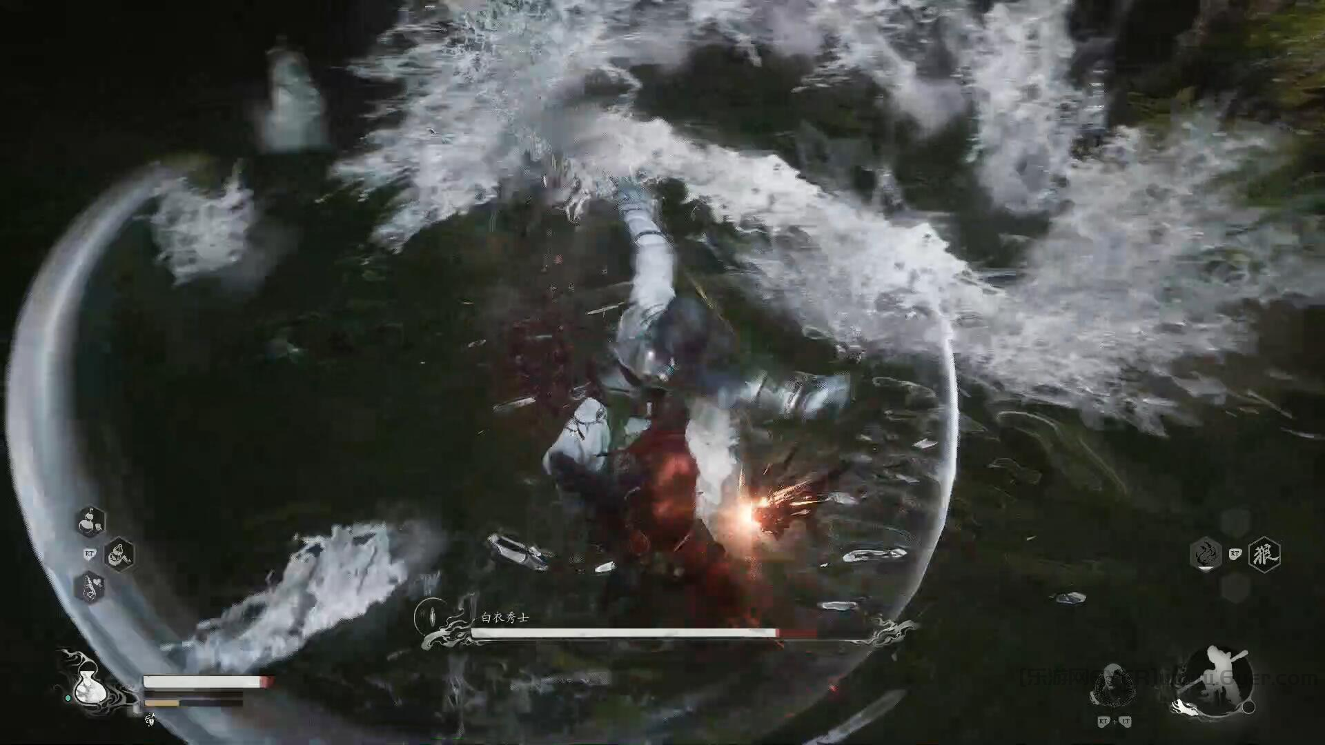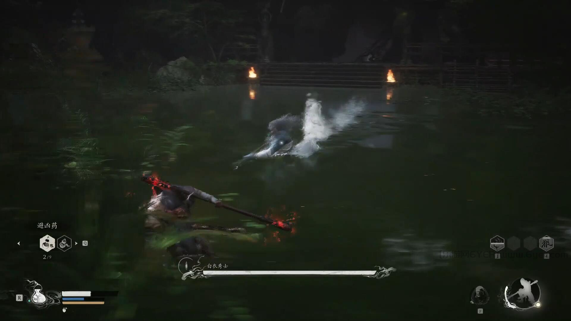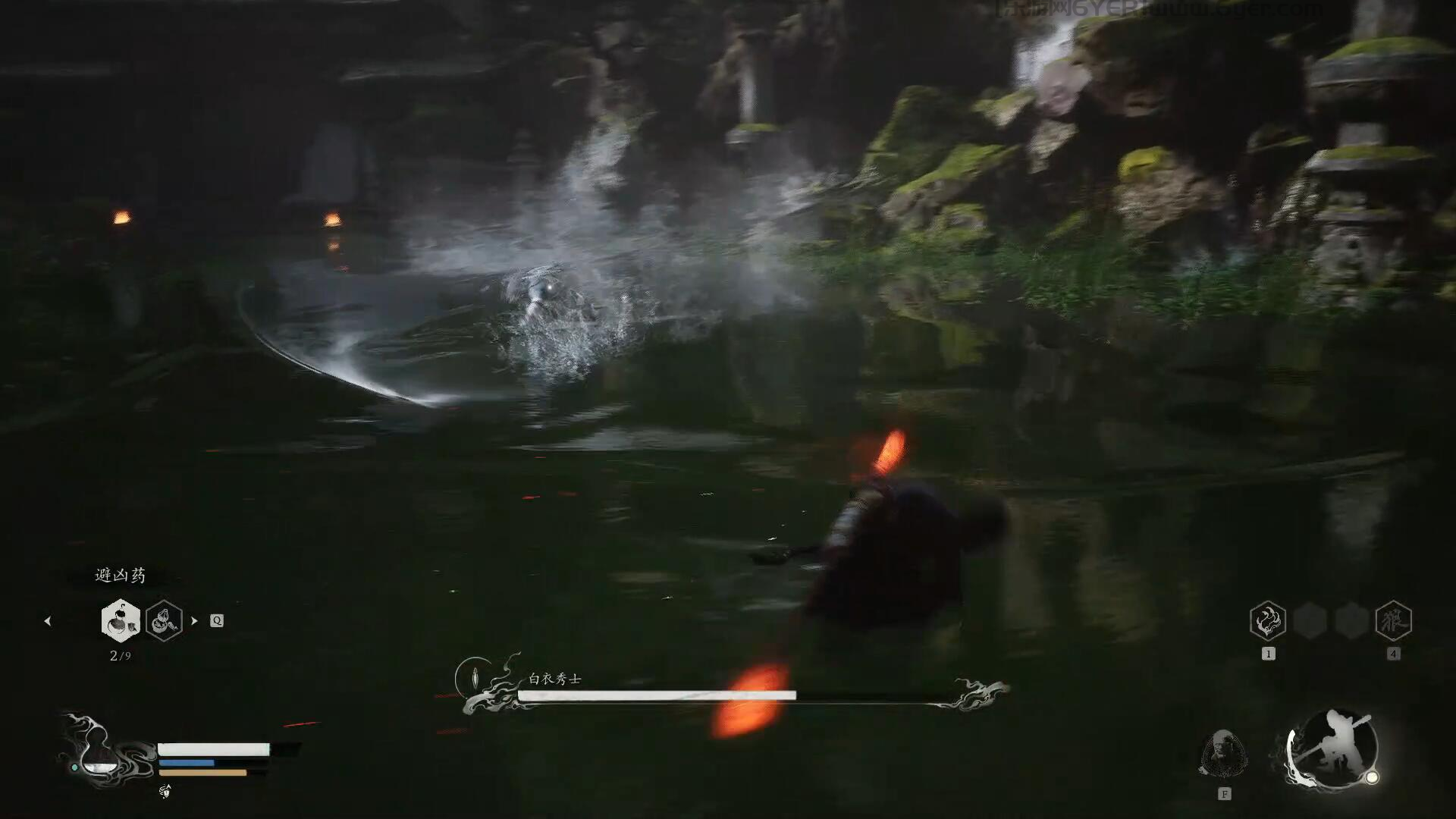 重头戏来了,白衣秀士是游戏中第一个遇到有两条命的boss,且第二条命的白衣秀士速度极快,玩家应把蓝量节省到第二条命再用,方便多次施展定身术。