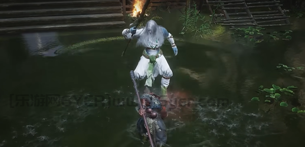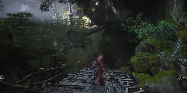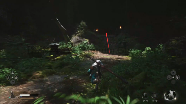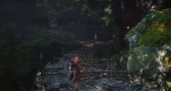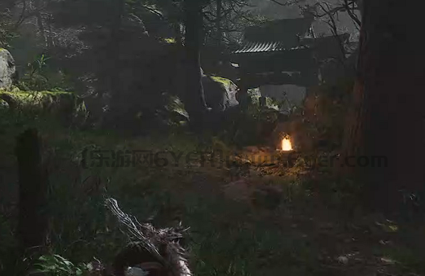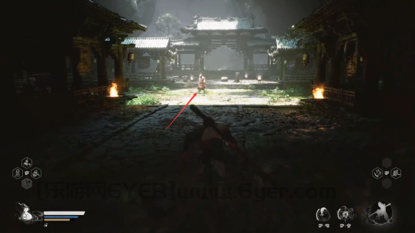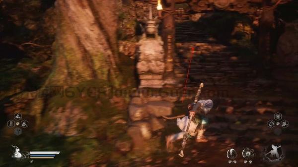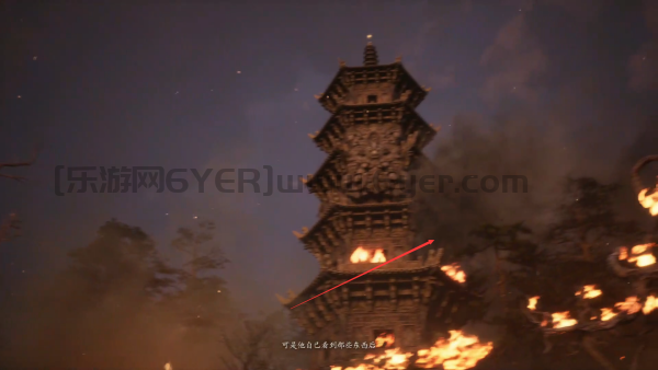 4、通过后,玩家将会看到一个正在燃烧的塔,就在这个位置黑熊精将会出现。