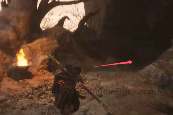 接着我们往回走,过了几个火盆后到下面,接着我们往左走,走到前方有火盆的大石头位置后,立刻左转。