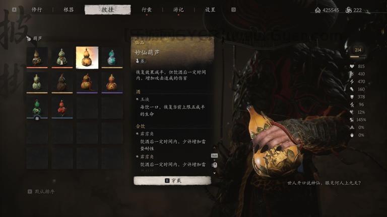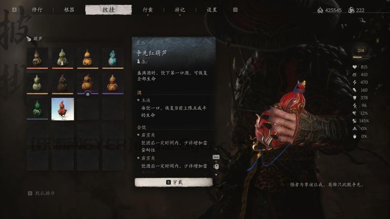 黑神话悟空酒葫芦前期推荐用争先红葫芦,因为它的效果是第一口可以恢复全部的生命值,在前期可以说是神器,后期推荐用升级过的上清宝葫芦,因为可以喝十口,回复量巨大。
