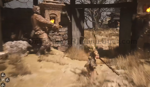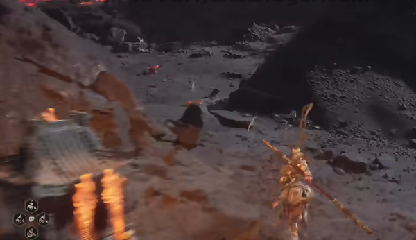 1、首先我们来到火焰山-谷口。面向土地庙作战一直前进。直至走到有个下坡的缺口,我们顺着下坡走下去。