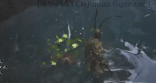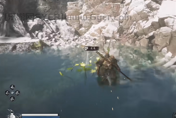 2、我们一直下坡前进,继续往前走可以看见前面有一处池塘,我们往池塘靠近山体的方向搜寻就能看见碧藕,点击采集即可。