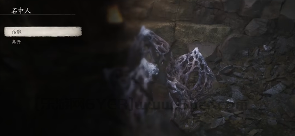 2、直至走看见一个独木桥,我们直接跳下去,然后会看见一个淡紫色的“石中人”,我们与其交互,点击沽取,就可以购买铁弹了。