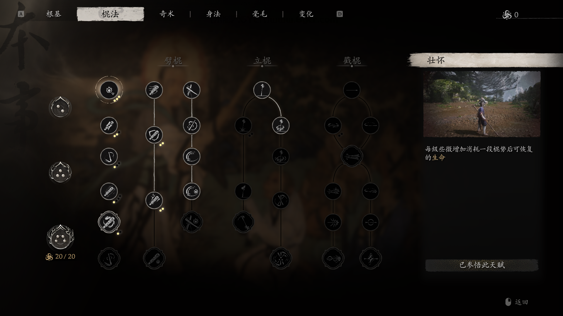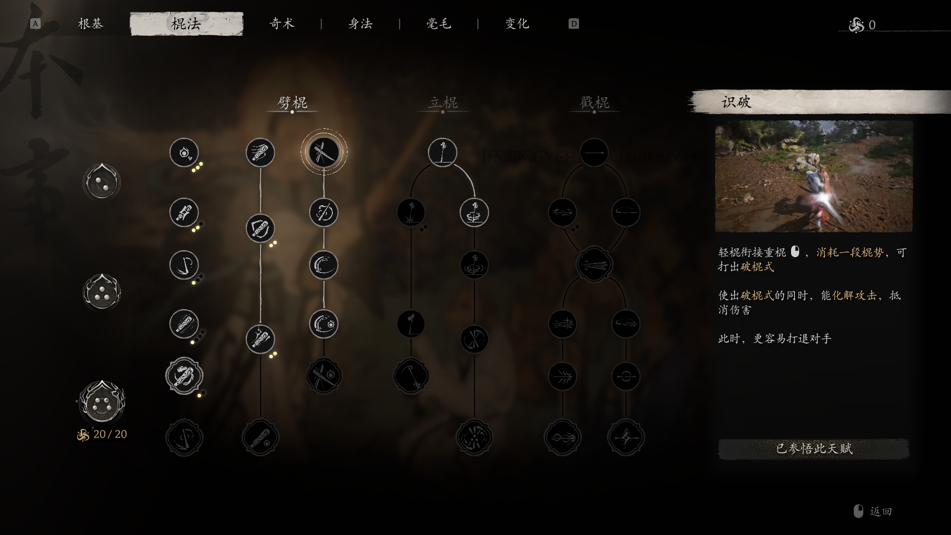3、劈棍详解,加点选择“展足”和“识破”,劈棍不是蓄力的重击,在首段中玩家可以移动,劈棍的威力和范围于棍势相关,适合对付笨重的BOSS。