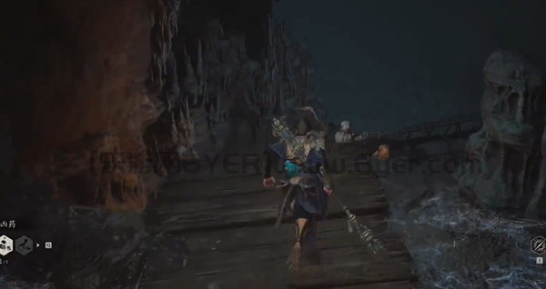 2、首先传送到盘丝洞的绝想崖,接着沿着一系列特定路径前行。先跳下平台后向右侧进入旁边的洞穴,随后向左转走过桥,再穿过前方的独木桥和蜘蛛卵区域,出去之后向左转并登上楼梯,最后能够看到一个亭子。