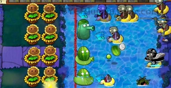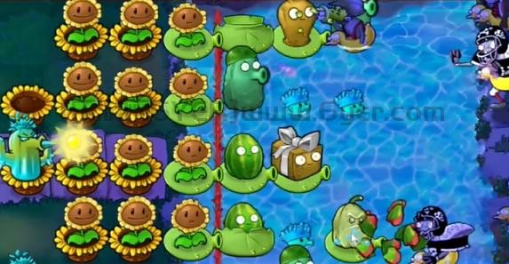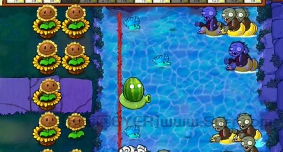 4、继续在左侧补充多个向日葵花盆和受伤的向日葵,在右侧种植两个西瓜坚果。