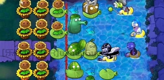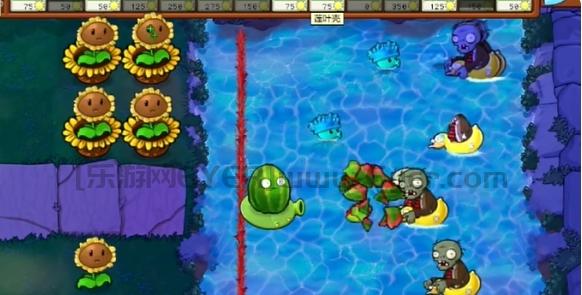 2、先在水池中种植两个寒冰小喷菇,在左侧种植三个受伤的向日葵。