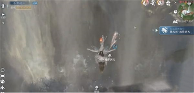 1.我们首先来到镜天阁(1095,993)的位置附近,进入瀑布中的山洞,接取任务。