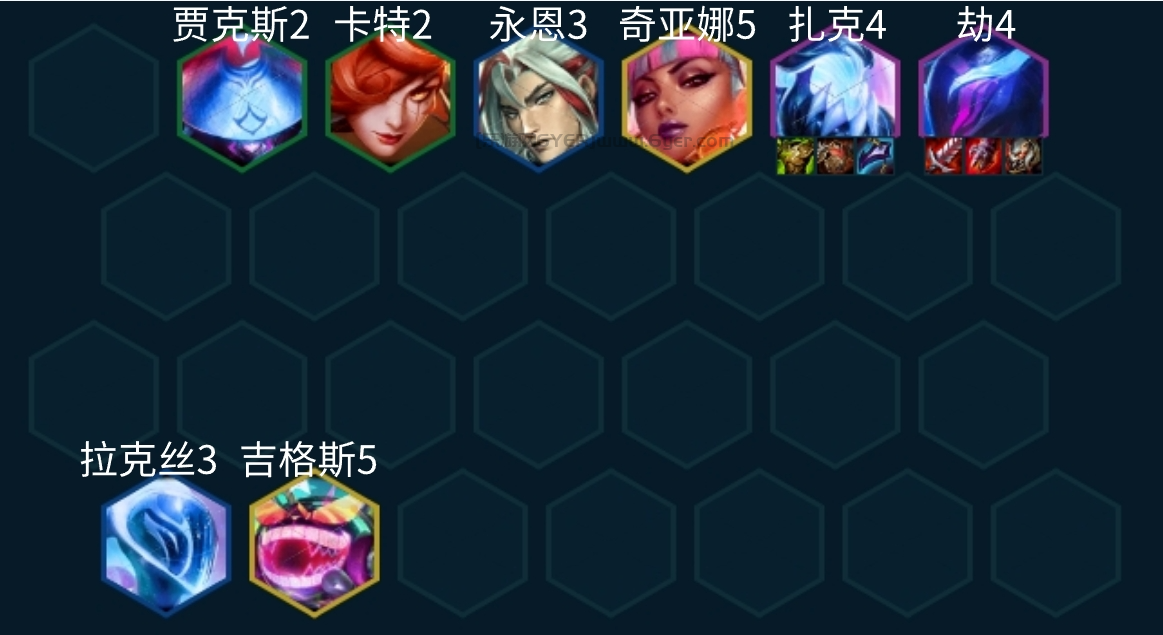劫的伤害偏单体爆发,所以后续需要法装来给拉克丝和吉格斯补伤害帮助清场。甚至打后排脆的阵容我们还能选择器给拉克丝,大家一起放激光,变阵比较灵活,所以学会了可以根据对位去调整来取得优势。吃分非常简单,但是要吃鸡更多要看二星五费或者三星劫。