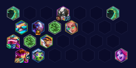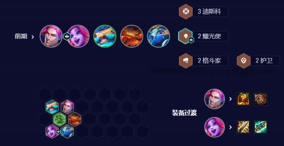 正常情况下,可以大部分弈子站迪斯科灯球周围抱团,卡牌站左侧底角安全输出,娜美站右侧底角拉仇恨,机器人带肉装顶第一排。