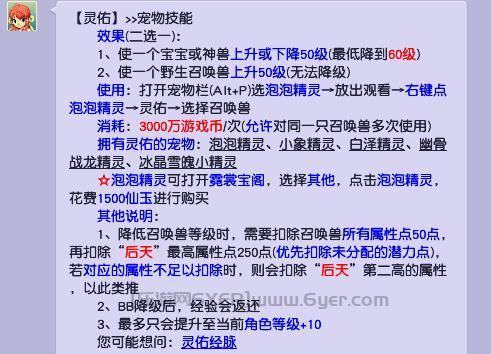1.灵佑:使神兽下降50级(最低降到60级,且灵佑也可使神兽上升50级)。这方法可以最快速的降级,但是消耗:3000万游戏币,花费较高。