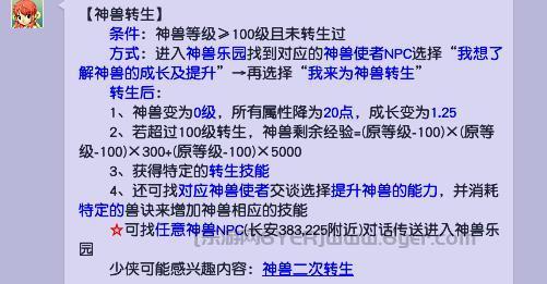 2.神兽转生:每只神兽有2次转生的机会,只有第一次转生会降低等级(转生成0级),第二次转生等级不变。转生消耗最少,如果你神兽没有转生的话直接转生就可以。