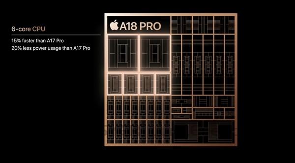A18 Pro的CPU核心保持了6核心的配置,包括2个性能核和4个能效核。与A18相比,A18 Pro的缓存更大,同时还集成了下一代ML机器学习加速器。官方数据显示,A18 Pro相较于A17 Pro的性能提升了15%,而功耗则降低了20%,被誉为史上最快的手机CPU。