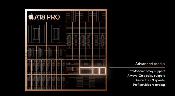 A18 Pro还带来了全新的媒体显示引擎,支持ProMotion显示技术、始终显示功能、更快的USB3接口、ProRes视频录制,以及新的视频编码器。这款编码器的编码速度是旧款的两倍。