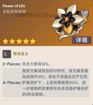 2、该圣遗物四件套时角色施放元素战技后的10秒内,岩元素伤害加成大幅度提升。