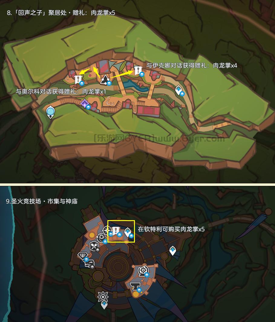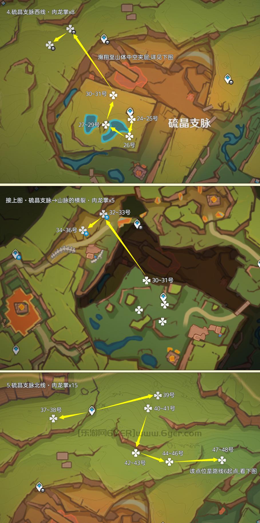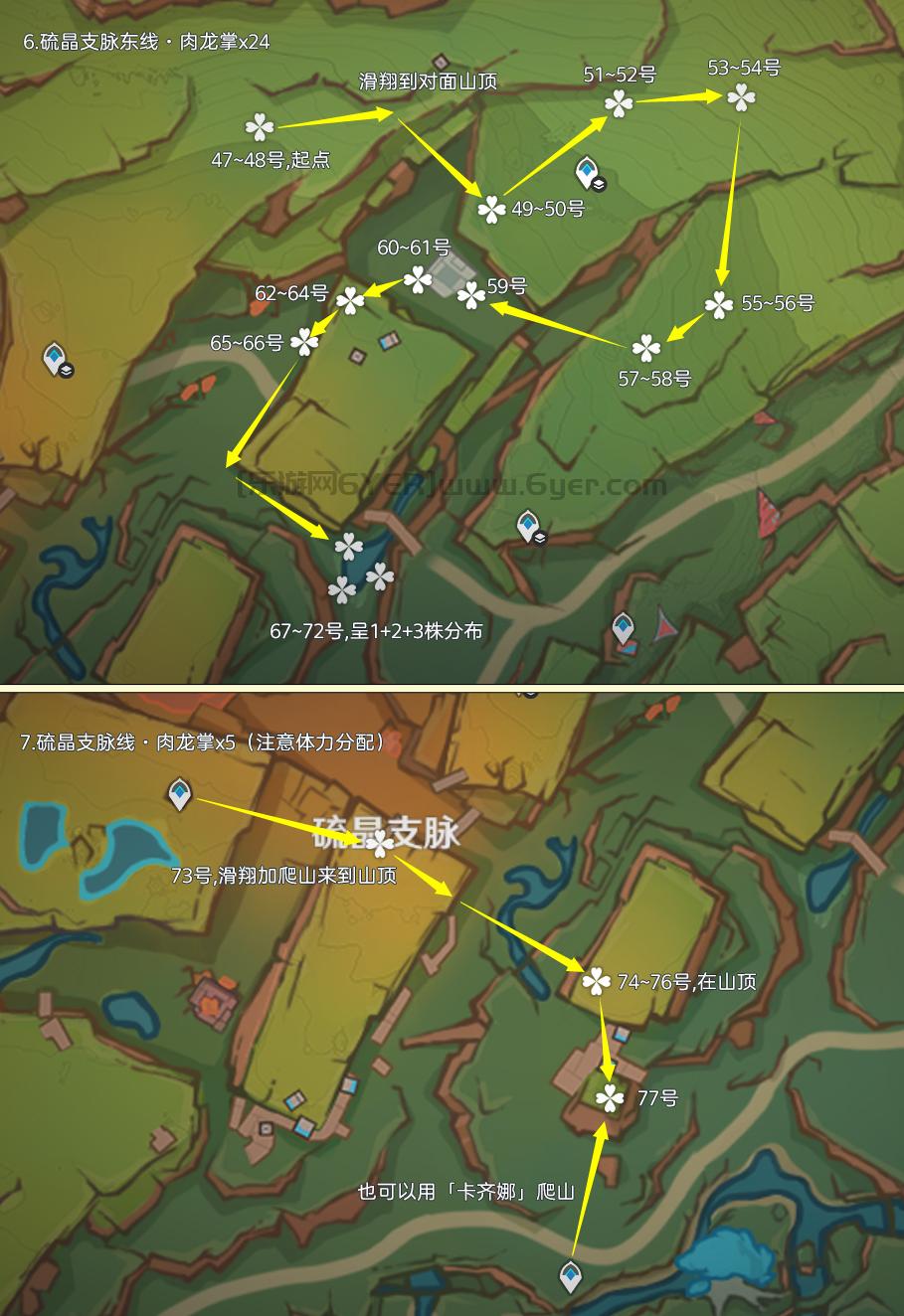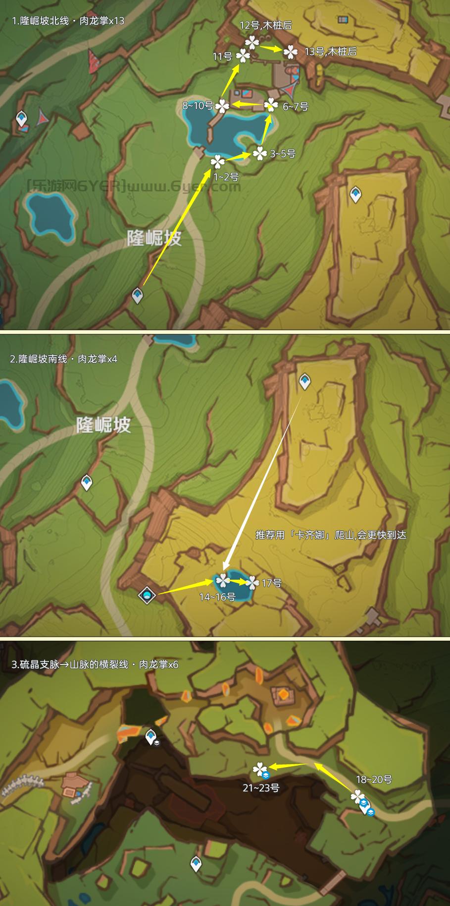 肉龙掌点位仅分布在纳塔「坚岩隘谷」区域,其中可重复采集数量为77株,制作路线时尽量遵循从上往下游,视野高好看清,方便旅行者探索。