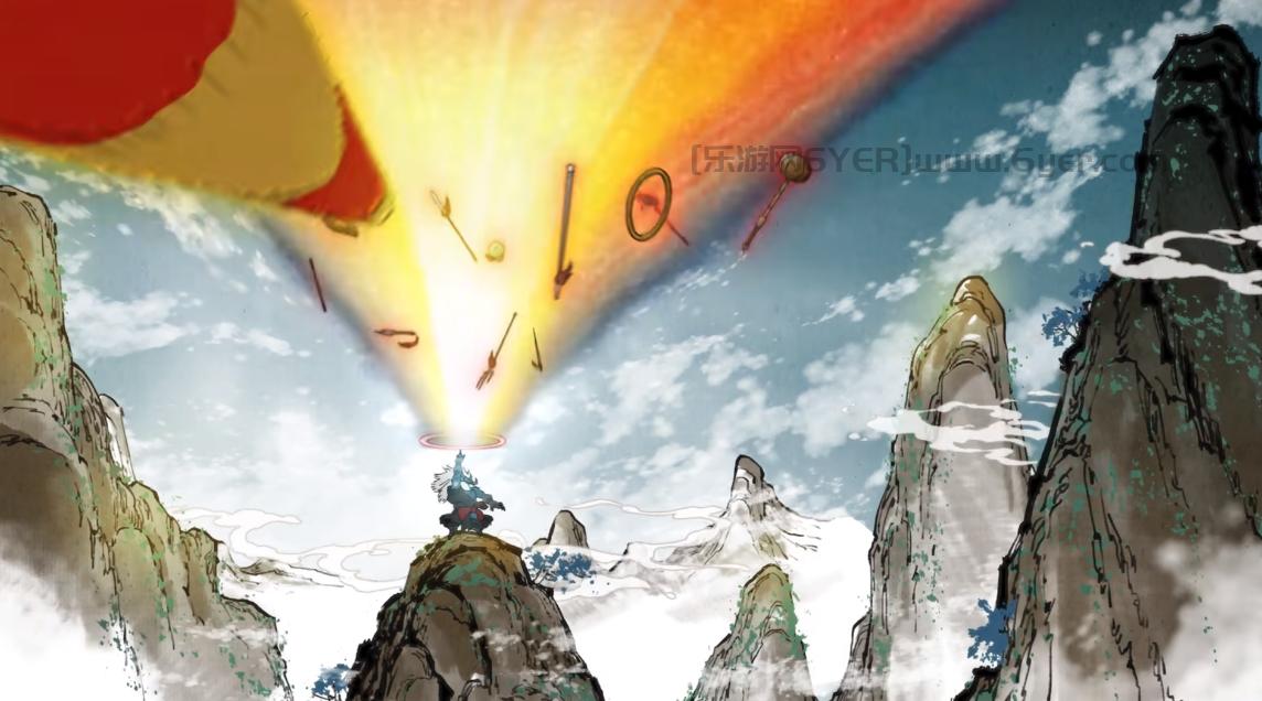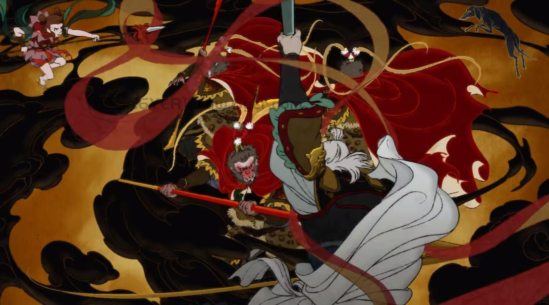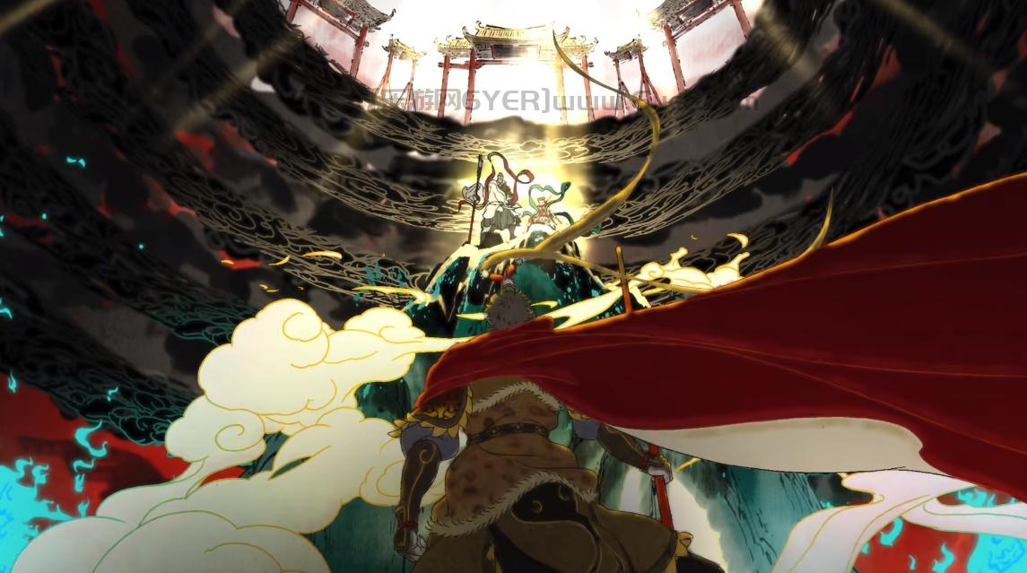 紧接着画面一转天地开站在云端的是二郎神和哪吒率领的天兵天将,这里应该是更早的大闹天宫了,不仅画面张弛有力,音乐的顿挫感也让动画变得更加传神,只见大圣分身与二郎神和哪吒战在了一起。