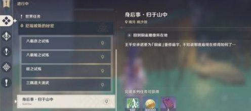 1、身后事归于山中的触发条件:需要完成【身后事·诸事平安】即可,完成之后的第二天凌晨四点会自动接取任务,这次完成任务会获得150经验、30000摩拉和3本经验书。