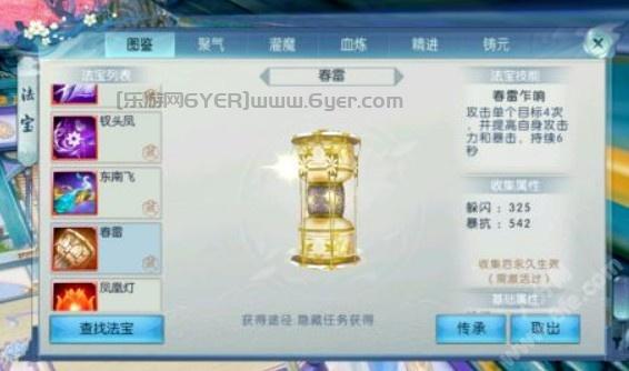 春雷是一个腰鼓形状的法宝,需要通过一系列隐藏才能得到。作为武器时,生成技能春雷乍响,能够攻击单个目标四次,造成85%的伤害。当然啦,春雷还可以当做坐骑,闪闪发光的精致的腰鼓还是很吸引人的哦。要获得春雷当然也不容易,需要定时定点收集四张词谱合成。