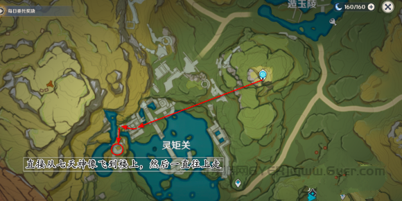 进入游戏之后,从灵矩关的七天神像出发,按照下图路线到达灵矩关左侧的山峰上,即可自动触发任务;