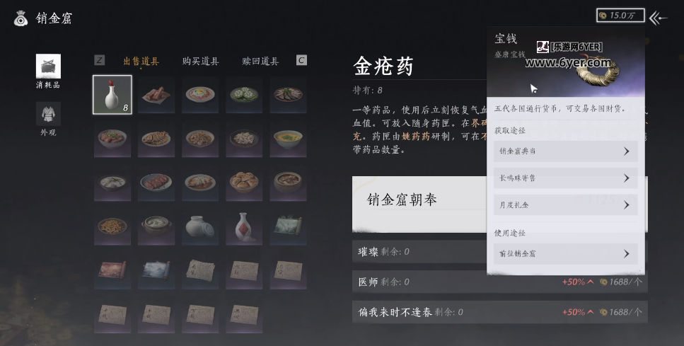 宝钱:购买服装和道具,还可以兑换成铜钱在消金窟中购买制作金疮药。