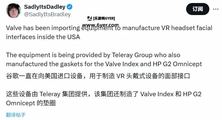 消息人士SadlyItsBradley透露,Valve近期从Teleray集团进口了多批VR头显面部贴合部件。值得注意的是,Teleray此前曾为Valve Index和惠普G2 Omnicept提供过面部衬垫。