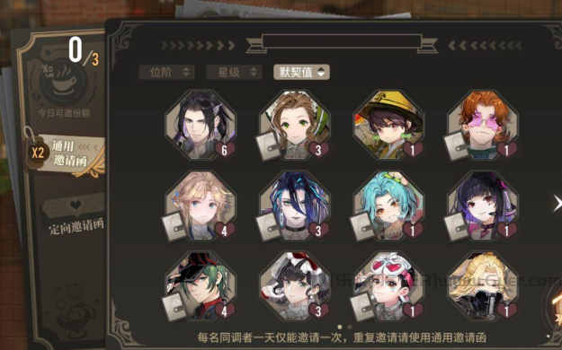 午后茶憩玩法是游戏中重要的同调者养成玩法,在这个玩法中我们可以通过和每一个同调者的互动来提高和他们之间的默契值,并且收获家居礼品券。点击右下角的午后茶憩玩法即可看到邀请栏,我们可以从拥有的所有同调者中单独邀请一个同调者喝下午茶,每天能够免费邀请三次,每个同调者每天只能邀请一次。若是玩家们拥有通用邀请函,即可重复使用通用邀请函邀请一个同调者,而定向邀请函能够指定邀请一个同调者。