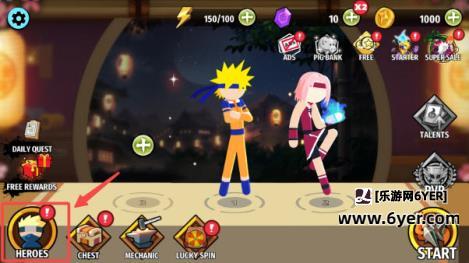 3、点击屏幕左下角的“heroes”即可打开角色面板。