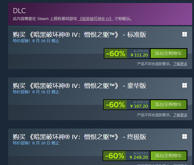 而资料片“憎恨之躯”,降价幅度超过了本体游戏。无论是标准版,还是豪华版或是终极版,统统降价60%。《憎恨之躯》标准版原价278元,现价只需111.2元。