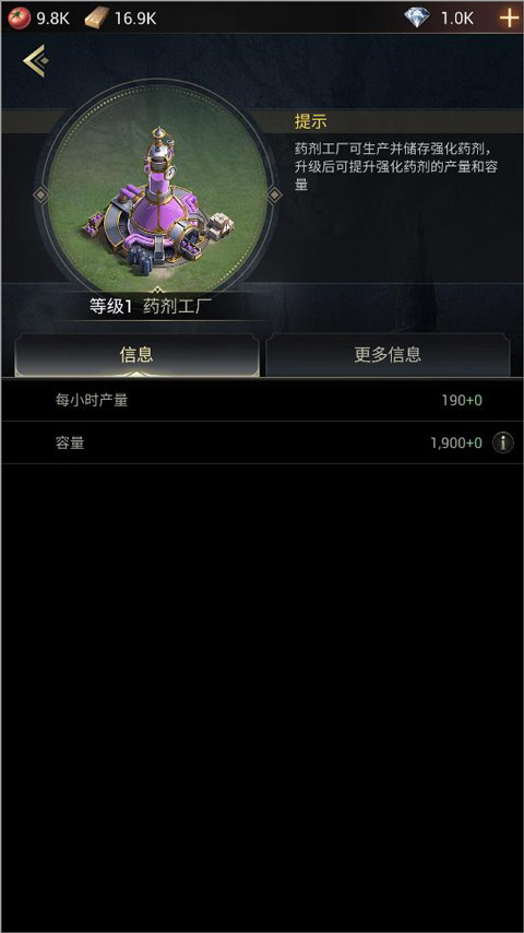 5、药剂工厂可生产并存储强化药剂,升级后可提升强化药剂的产量和容量;