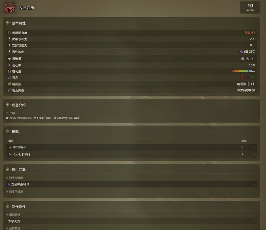 搭配一个能吹攻大的笛子,例如女王笛的攻大,回复速度大,然后换成这个笛子,吹防大加上会心攻击响玉,可以说攻防都在,甚至还能吹和耐力节约,节省抢走药,响周波打也很有利于打出头晕,总而言之非常建议配合女王笛。