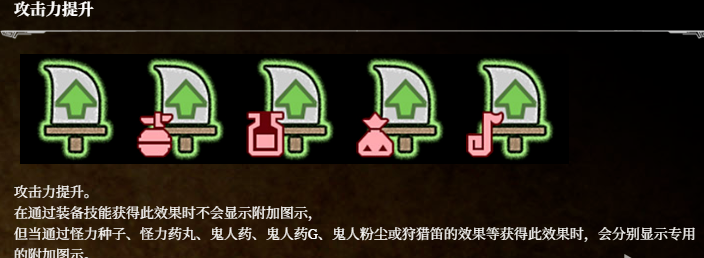 从左往右依次是装备技能,怪力种子(或怪力药丸),鬼人药(或鬼人药大),鬼人粉尘,狩猎笛的攻击力提升。