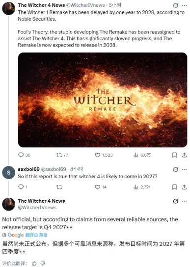 对于这个消息,有网友提问称如果报道是真的,那么《巫师4》很可能就在2027年发售?转发这个消息的推主回复说,虽然不是官方消息,但根据多个可靠消息人士的爆料,《巫师4》将于2027年第四季度发售。