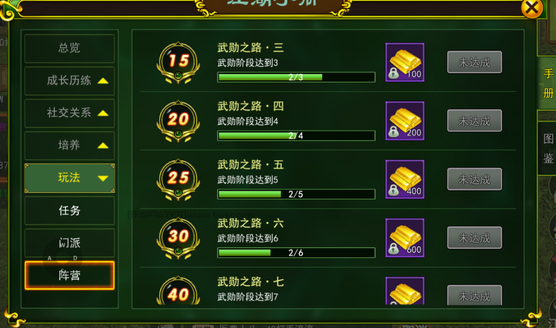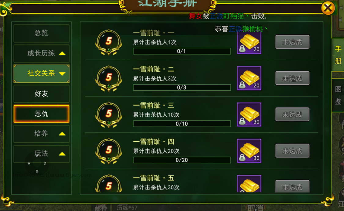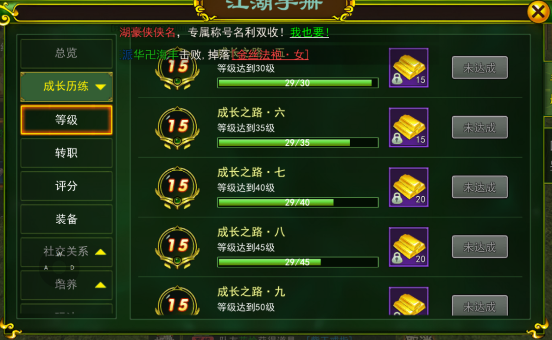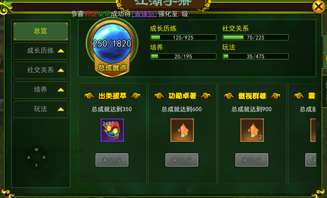 江湖手册内容分别是:成长历练、社交关系、培养、玩法,四个部分组成!每个部分对应不同的内容,同时成就点数也是在四大部分里面获取的。