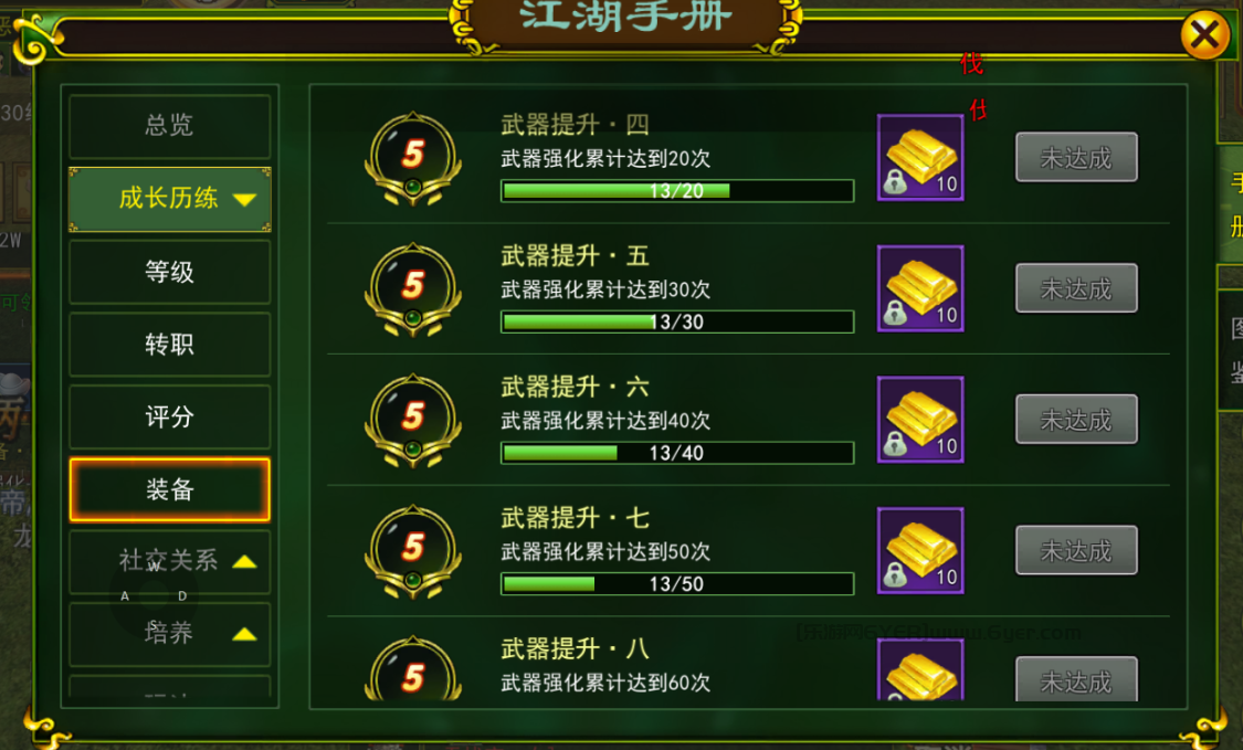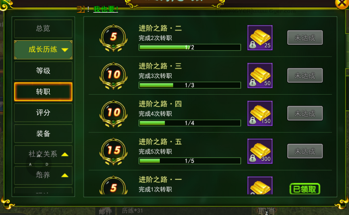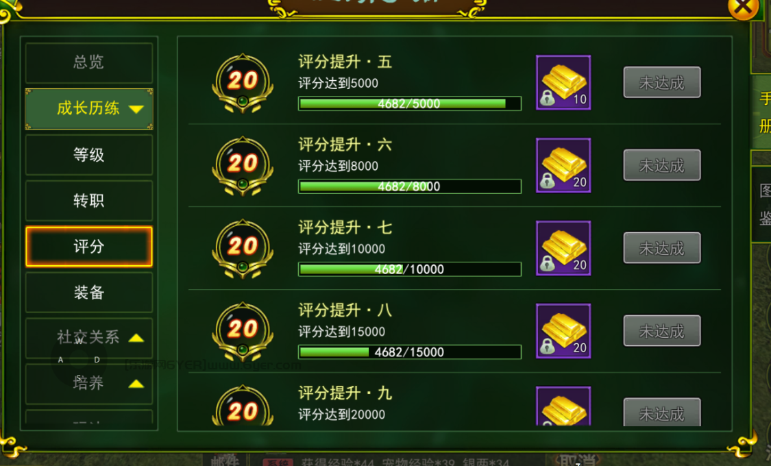 等级、转职、评分、装备,四个小部分组成,每完成一个小任务即可获得对应的成就积分和金条奖励!是非常不错的!