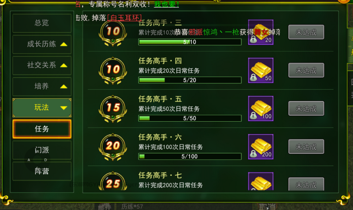 任务、门派、阵营三个小部分组成,奖励:金条、积分!