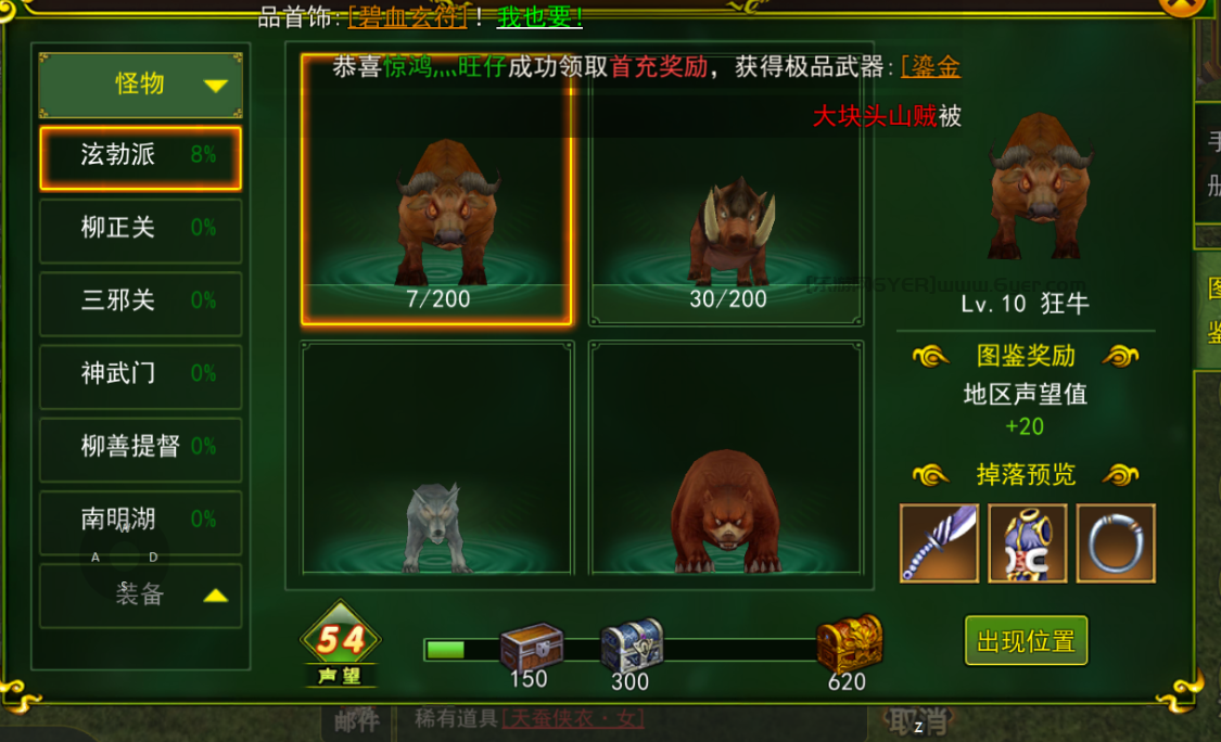 怪物:各大地图所拥有的怪物,击杀一定的数量的怪物即激活该怪物的图鉴,同时获取声望,达到一定声望奖励图鉴宝箱!