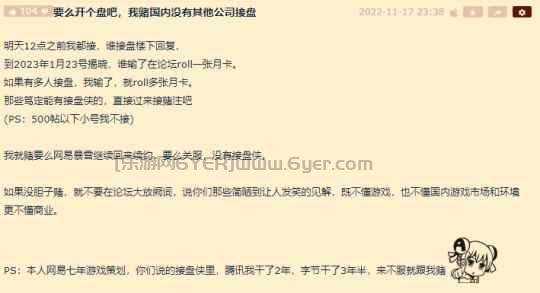 我们可以查到他在去年11月17日暴雪和前代理双方宣布不再合作的时候发布过一张帖子,帖子说过国内没有其他厂商可以接盘。他表示“要么前代理继续续约,要么关服,没有接盘侠”,而且跟人打赌一直到国服停服的1月23日。实际上他说的确实没错,因为即使到现在接近一年,也没有任何关于其他厂接盘的消息。