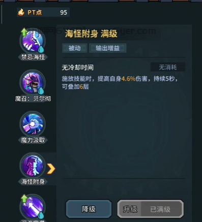 1、消耗当前的魔法值召唤海怪贝尔彻,且每秒将造成一次攻击。