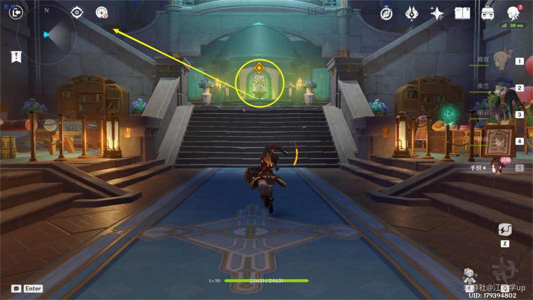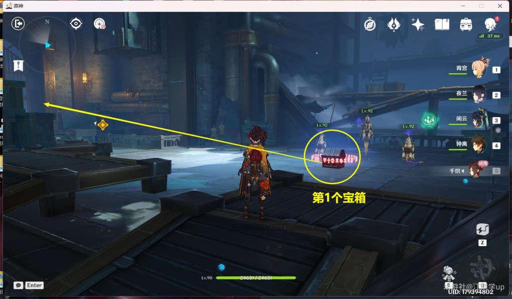 (8)继续追踪任务来到最后下图位置,利用【千织】的E技能和电梯一直上到最上面,打开上面开关后,门里面就是第3个【珍贵宝箱】,然后从宝箱前面进入水下后,随波逐流就会出副本了